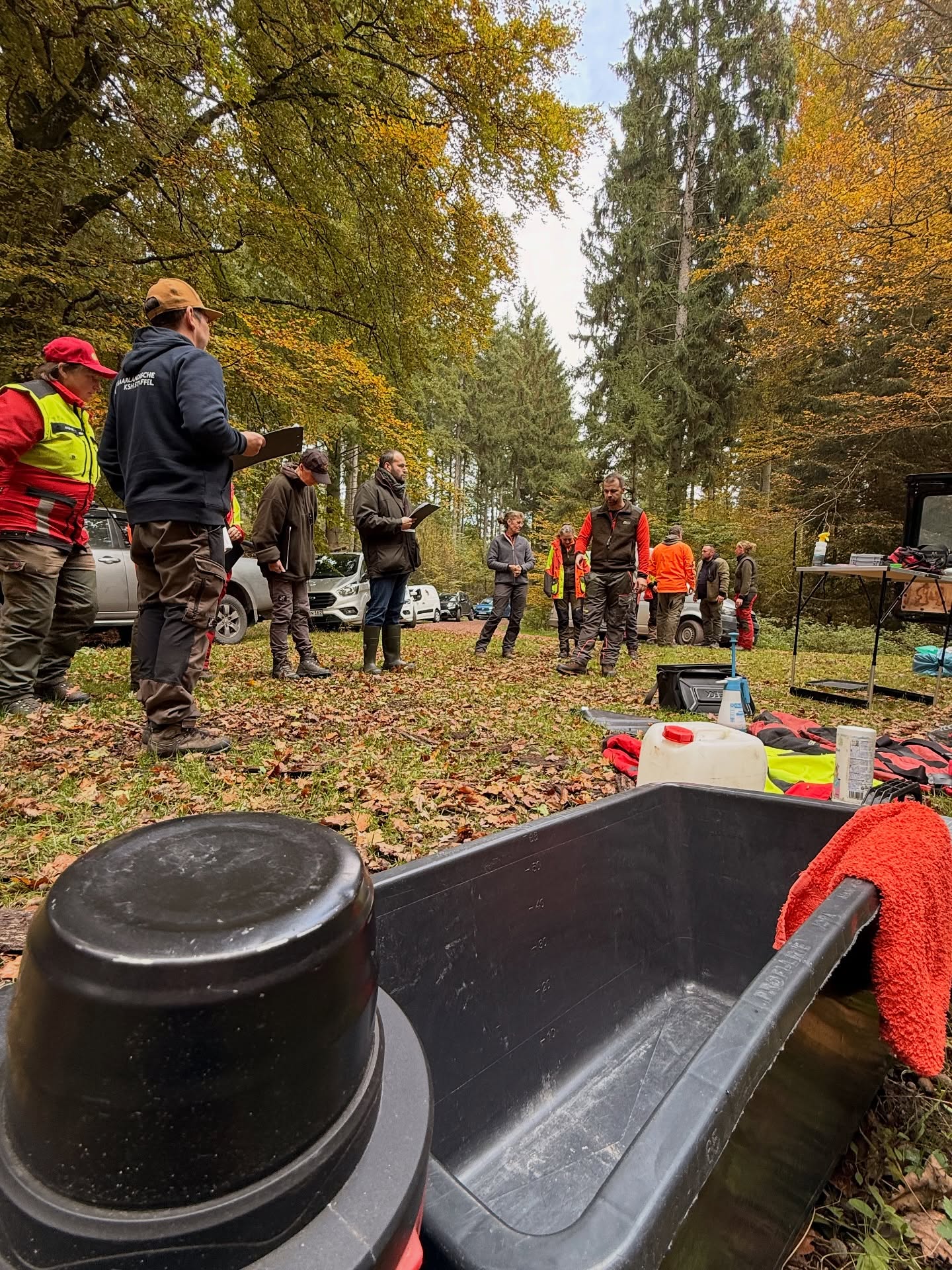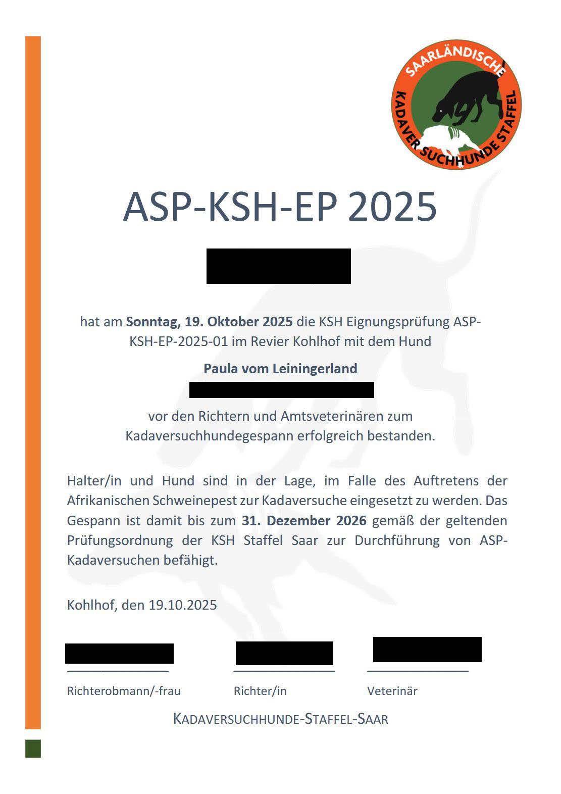 Nach den intensiven Ausbildungswochen stand am 19.10.2025die Eignungsprüfung für Kadaversuchhundegespanne (ASP-KSH-EP 2025) an! Unter den wachsamen Augen von 4 erfahrenen JGHV-Richtern (alle mit ASP-Hintergrund) und einem Amtsveterinär traten 9 Hundeführer:innen mit 11 Hunden zur Prüfung an. Geprüft wurde in 2 Richtergruppen in 4 Suchgebieten – in jedem lagen 3 Kadaver.